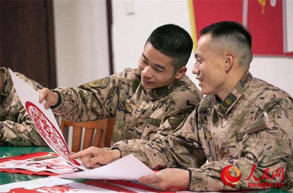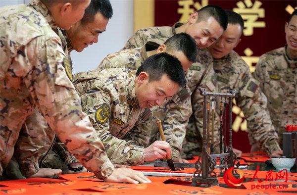“喜迎新春”“建功柏臘”……在“寫春聯、送福字”活動現場,官兵們一筆一劃在紅紙上勾勒出充滿軍營特色的書畫作品。