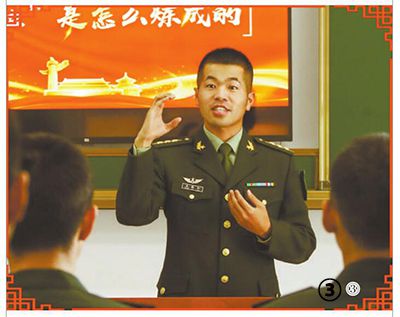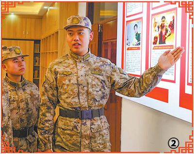圖②:趙第宇為連隊新兵介紹英模畫像。海日汗攝