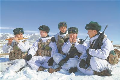這幅作品拍攝的是新疆軍區某邊防連官兵,在巡邏休息間隙開展文化活動的場景。畫面中戰士即興吹奏起笛子和口琴,戰友們簇擁在他們身旁。背景中的雪山、云朵映襯著戰友燦爛的笑容,從一個側面展現了邊防戰士樂觀向上的青春風采。(鈔飛航 張根實)