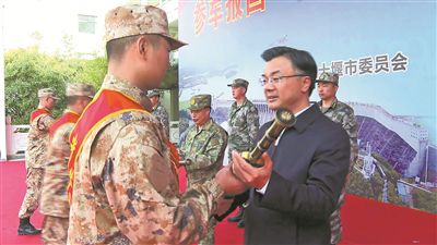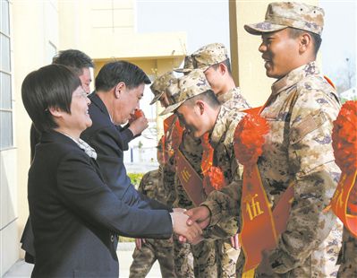 3月15日,山東省鄆城縣縣長張暉(左一)鼓勵新兵建功軍營。魏忠友攝