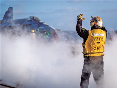 3月26日,美海軍人員在“卡爾·文森”號航母上指揮一架F/A-18E“超級大黃蜂”戰斗機。