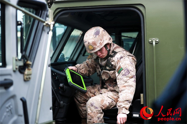 更換備用零件、讀取故障代碼、強制執行程序診斷……結合戰術背景和預設故障,修理分隊迅速分組展開搶修,一組對爆胎、破裂、變形等“硬殺傷”情況進行處置,另一組對元器件燒毀、控制程序紊亂失靈等“軟殺傷”進行排查,整體維修任務“模塊化”分工處置,搶修速度較以往提高一倍。高效的故障檢修歸功于全新的修理專業組訓模式。