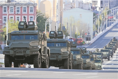 5月7日,俄羅斯首都莫斯科舉行衛國戰爭勝利日閱兵式彩排。圖為當日在莫斯科拍攝的即將參與彩排的裝甲車。