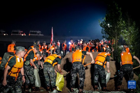 武警河北總隊邢臺支隊官兵在河北邢臺南澧河李召橋左岸大堤加固堤壩(7月31日攝)。新華社發(張羽 攝)