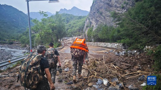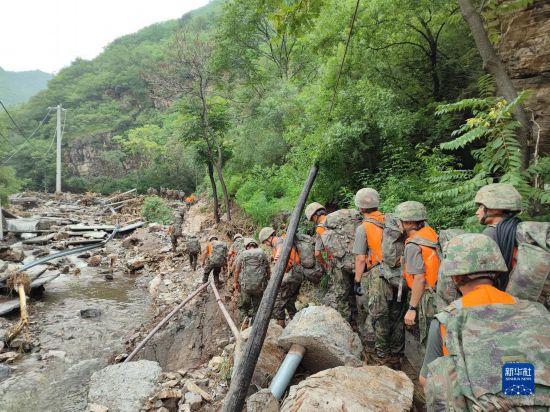因山洪暴發,北京市門頭溝區齋堂鎮交通中斷。武警北京總隊機動第一支隊應急救援隊徒步15公里山路,人均負重25公斤,為12個村運送食品、醫藥、防疫、照明等基礎物資,保障村民基本生活。