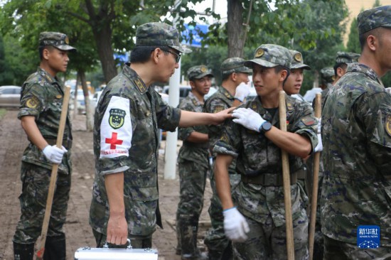 8月6日,武警河北總隊醫院巡診組在河北涿州陽光大街清理淤泥點位詢問戰士傷情。新華社發(楊雪乾 攝)