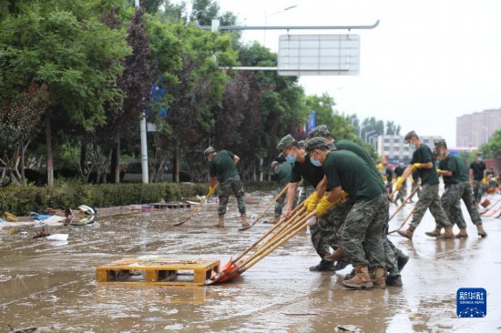 8月6日,武警河北總隊機動支隊官兵在河北涿州騰飛大街范陽路至朝陽路段清淤清障。新華社發(趙佳亮 攝)