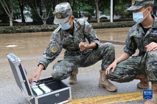 8月6日,武警河北總隊機動支隊官兵在河北涿州高新區騰飛大街勘測檢查氣體環境。新華社發(趙佳亮 攝)