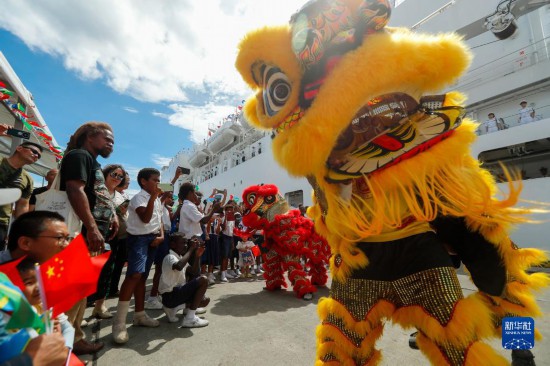 8月19日,中國海軍“和平方舟”號醫院船抵達所羅門群島霍尼亞拉港,所中商會組織舞獅表演歡迎中國海軍官兵的到來。新華社發(黎宇 攝)