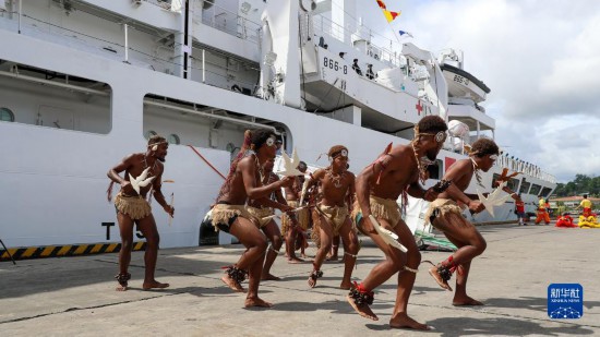 8月19日,中國海軍“和平方舟”號醫院船抵達所羅門群島霍尼亞拉港,身著傳統服飾的當地民眾跳起舞蹈迎接。新華社發(黎宇 攝)