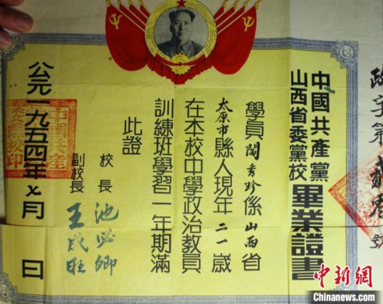 閆秀珍的畢業證(翻拍老照片)。楊俊欽攝