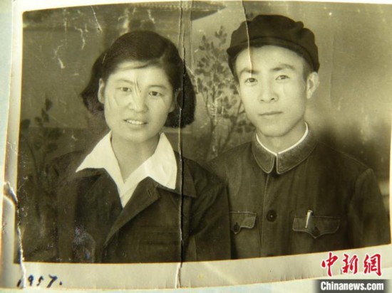1957年,閆欣秋夫妻合影(翻拍老照片)。楊俊欽攝