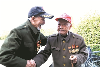 抗美援朝老兵龍家有(左)再見老戰友劉揮(右)。李盼攝