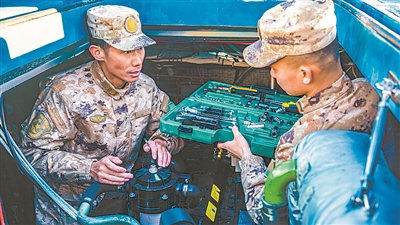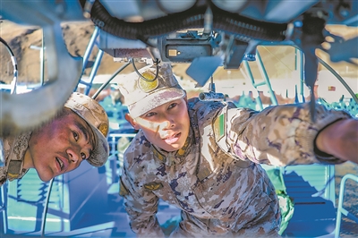 李小兵(右)指導戰友檢修巡邏艇部件。戴學武攝