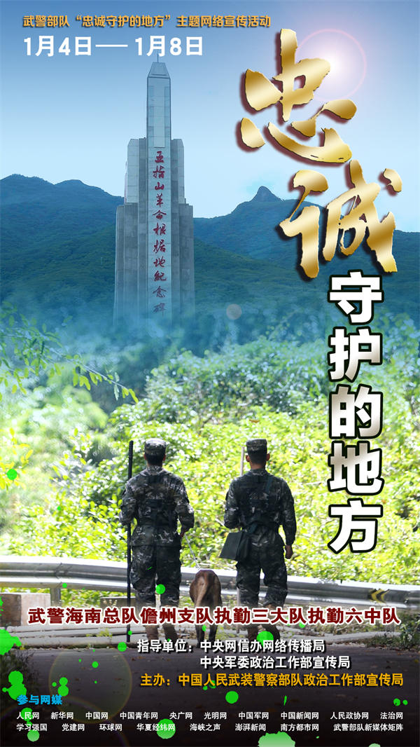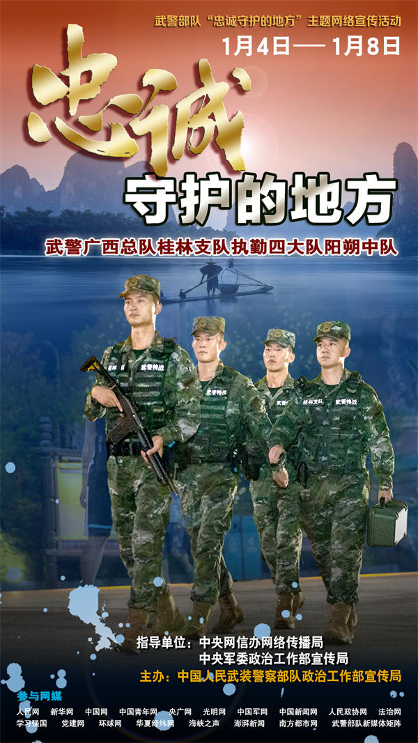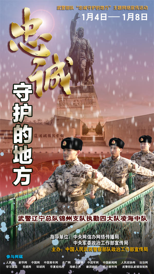 人民網北京1月4日電 (陳羽)萬家燈火有我守護,平凡哨位書寫忠誠。無論北疆雪原還是南域海島,無論繁華都市還是大漠荒灘,祖國各地到處都有武警官兵站哨執勤的身影、到處都是他們忠誠守護的地方。為真實反映新時代武警部隊忠誠擔當使命、守衛社會安寧的堅強決心和堅定行動,立體展現“人民武警愛人民、人民武警為人民”的宗旨情懷,近期,在中央網信辦網絡傳播局和中央軍委政治工作部宣傳局指導下,武警部隊政治工作部宣傳局策劃組織了“忠誠守護的地方”主題網絡宣傳活動,集中對武警遼寧總隊錦州支隊執勤四大隊凌海中隊、廣西總隊桂林支隊執勤四大隊陽朔中隊、海南總隊儋州支隊執勤三大隊執勤六中隊、陜西總隊銅川支隊執勤一大隊等4個先進基層單位,進行面對面采訪和網絡化報道。