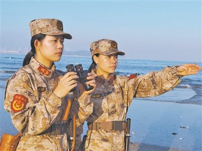 王莉紅(左一)同哨兵何梅華在岸灘巡邏。 陳小華攝