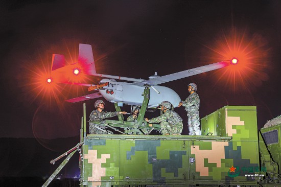 夜幕降臨,無人機完成任務后順利返航回收。不久,另一架次無人機點火發射,展開新一輪訓練……(黃保傳 郭飛 郭江偉)