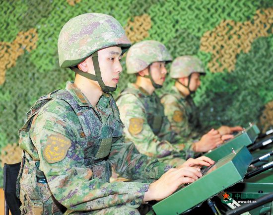 官兵在模擬機上操作訓練。