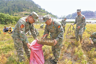 近日,浙江省磐安縣人武部組織民兵前往新渥街道莊基社區,幫助藥農采收中藥材。