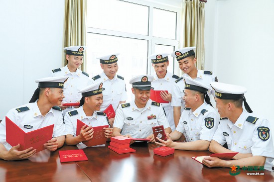 海軍某部三級軍士長肖升(前排中)向新兵介紹自己獲得的榮譽,激勵新兵立足崗位、建功軍營。劉再耀 攝