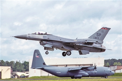 演習期間,一架F-16戰斗機和一架C-130J運輸機進行起降作業。