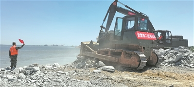 7月7日,湖南省岳陽市華容縣團洲垸洞庭湖潰堤封堵現場,武警第二機動總隊某支隊官兵操作機械進行決口封堵作業。桑喜生 攝