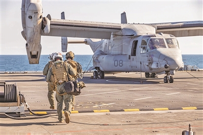 7月中旬,美海軍陸戰隊人員走向“魚鷹”運輸機。