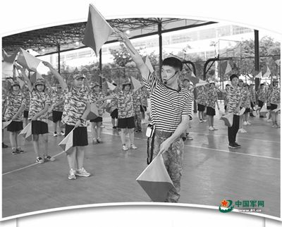 有的在凸顯海軍特色上下功夫。第10批軍訓團在訓練中加入海軍旗語項目,在初一學生中組建一支動作整齊、富于節奏感的旗語隊伍。