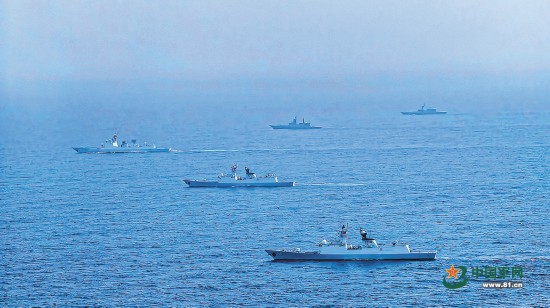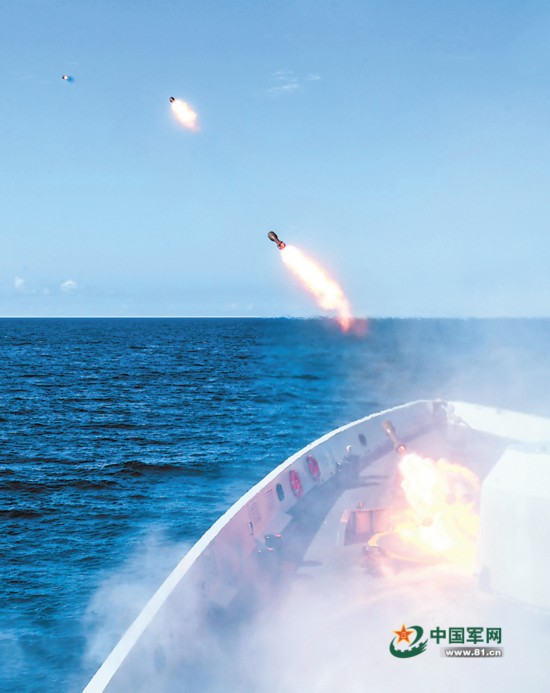 海上演練階段,茫茫大海上,聯合偵察預警、聯合搜救、聯合防空反導等課目輪番上演。雙方艦艇綜合使用各種武器,對高速靶機模擬的來襲反艦導彈進行攔截;編隊指揮所通報訓練海區發現人員落水,命令編隊按照責任區劃,立即組織?毡﹂_展聯合搜救……