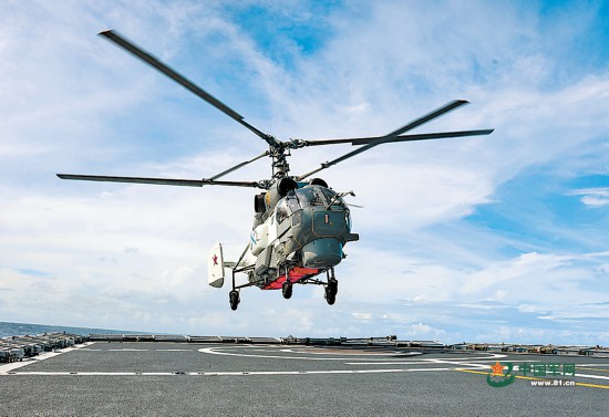 俄方艦載直升機在中方艦艇上降落。楊云翔 攝