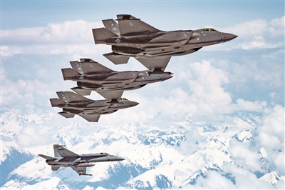 美空軍F-35A戰斗機在瑞士空軍F/A-18C戰斗機護航下飛越阿爾卑斯山。