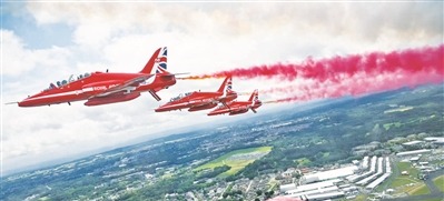 英國紅箭飛行表演隊在范堡羅航展上進行飛行表演。