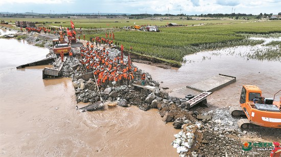截至8月14日13時,內蒙古赤峰市松山區太平地鎮八臺營子村老哈河左岸段堤防潰口已合龍。目前,第79集團軍某旅、武警部隊官兵以及當地民兵和地方搶險救援力量,持續向合龍部位拋擲沙土袋,進一步鞏固合龍效果。