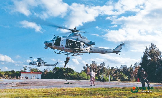 12月4日,美國海軍陸戰隊員在日本沖繩漢森營地進行UH-1Y直升機索降訓練。