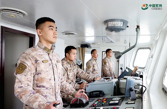 航海兵在駕駛室操縱船艇航行。苗青 攝