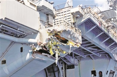 杜魯門”號航母撞船后,右舷外延部分受損。