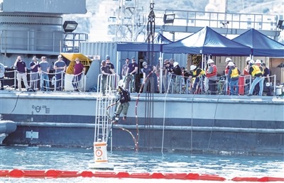 美軍在圣迭戈港打撈墜海的EA-18G“咆哮者”電子戰飛機。