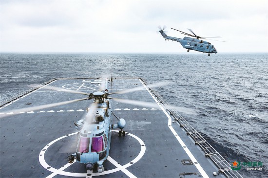 我艦載直升機從祁連山艦甲板起飛。解放軍報特約通訊員 喬晨曦攝