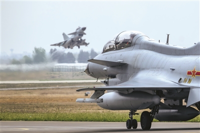 近日,南部戰區空軍航空兵某旅開展飛行訓練。圖為戰機接續起飛。肖 銳攝