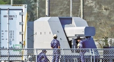 日本海上自衛隊“飛鳥”號試驗艦上安裝的新型電磁軌道炮。