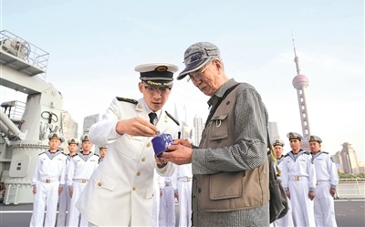 在人民海軍成立七十六周年之際,海軍在多個城市港口同步舉行艦艇開放活動。圖為在上海舉行的艦艇開放活動中,一名游客與沂蒙山艦官兵交流。