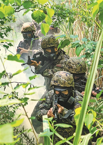 近日,武警廣西總隊桂林支隊開展戰術訓練。圖為官兵在山林地搜索前進。施晨洲攝
