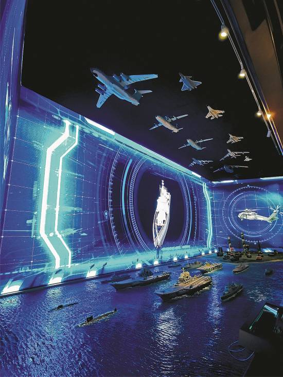 海軍武器裝備技術廳里,同樣人流如織。一群學生剛進入大廳就連連驚呼。眼前,是航母編隊的模型。海上,我國的航母編隊整齊列陣,破浪前行;空中,預警機和各種戰斗機有序展開,與水面上的各種戰艦遙相呼應。巨大的電子屏幕上,深藍色的海水襯托得戰艦更加威武、高大。